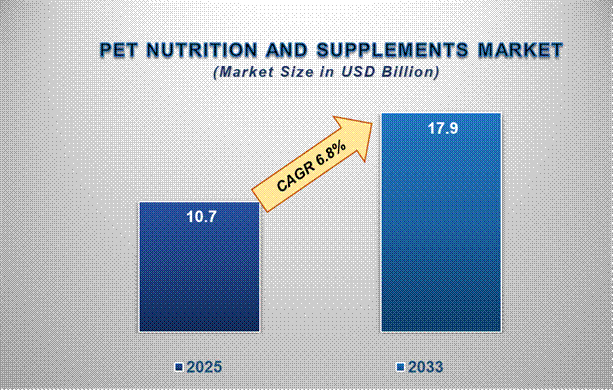 The global pet nutrition and supplements market is experiencing accelerated growth, fueled by rising pet humanization trends, increased awareness about pet health, and the growing prevalence of chronic diseases in companion animals. Valued at USD 10.6 billion in 2025, the market is projected to reach USD 17.9 billion by 2033, growing at a CAGR of 6.8% during the forecast period.