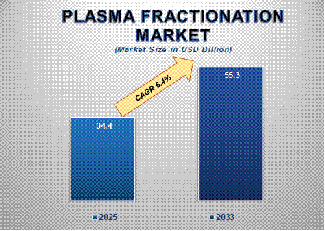 The Global Plasma Fractionation Market is witnessing steady expansion, driven by rising demand for plasma-derived therapies, increasing awareness about rare and chronic diseases, and advancements in healthcare infrastructure across developing economies. Valued at USD 34.4 billion in 2025, the market is forecasted to reach USD 55.3 billion by 2033, growing at a CAGR of 6.4% over the forecast period.