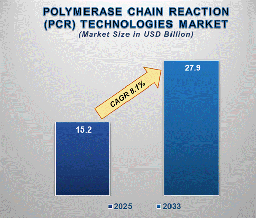 The Polymerase Chain Reaction (PCR) Technologies Market is anticipated to experience substantial growth from 2025 to 2033; the increasing incidence of infectious diseases is a key factor propelling this growth. With an estimated valuation of approximately USD 15.2 billion in 2025, the market is expected to reach USD 27.9 billion by 2033, registering a robust compound annual growth rate (CAGR) of 8.1% over the decade.