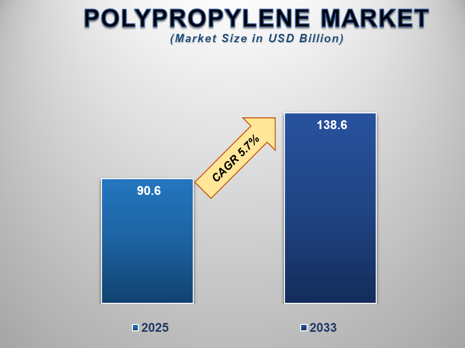 The global polypropylene market was valued at USD 90.6 billion in 2025 and is projected to reach USD 138.6 billion by 2033, registering a CAGR of 5.7% during the forecast period. Polypropylene (PP) is one of the most widely used thermoplastic polymers, known for its durability, lightweight properties, chemical resistance, and versatility. It is extensively used in packaging, automotive components, textiles, consumer goods, and industrial applications. The material’s cost-effectiveness and adaptability to various processing methods, such as injection molding and extrusion, have made it a preferred choice in multiple industries.