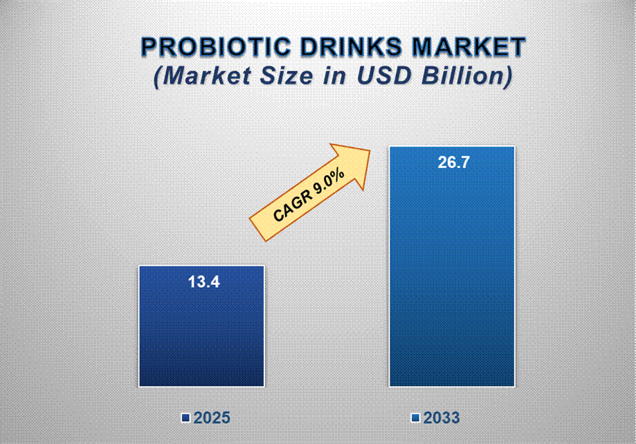 The Probiotic Drinks Market size is anticipated to experience substantial growth from 2025 to 2033, fuelled by rising demand for functional beverages to promote digestive health. With an estimated valuation of approximately USD 13.4 billion in 2025, the market is expected to reach USD 26.7 billion by 2033, registering a robust compound annual growth rate (CAGR) of 9.0% over the decade.