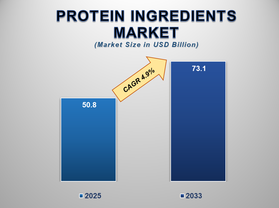The global Protein Ingredients Market is projected to grow from USD 50.8 billion in 2025 to USD 73.1 billion by 2033, registering a CAGR of 4.9% during the forecast period. Protein ingredients are critical components in food, beverages, nutraceuticals, and animal feed due to their essential role in muscle development, tissue repair, and overall health. The market is witnessing significant demand driven by the rising consumer preference for high-protein diets, functional foods, and sports nutrition products.
