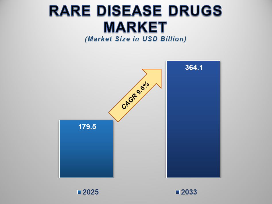 The global Rare Disease Drugs Market size is expected to grow from USD 179.5 billion in 2025 to USD 364.1 billion by 2033, expanding at a CAGR of 9.6% during the forecast period. Rare diseases, defined by their low prevalence, often lack sufficient treatment options and are frequently overlooked in traditional drug development pipelines. However, growing awareness, patient advocacy, and orphan drug incentives have driven a robust shift in R&D focus toward rare disease therapeutics.