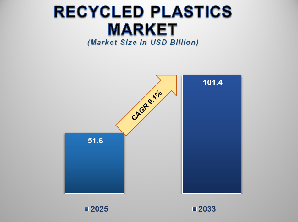 The global Recycled Plastics Market is projected to grow from USD 51.6 billion in 2025 to USD 101.4 billion by 2033, expanding at a CAGR of 9.1% during the forecast period. As global awareness of plastic pollution intensifies, governments, corporations, and consumers are increasingly focusing on sustainable alternatives—driving strong demand for recycled plastics across packaging, construction, textiles, and automotive industries.
