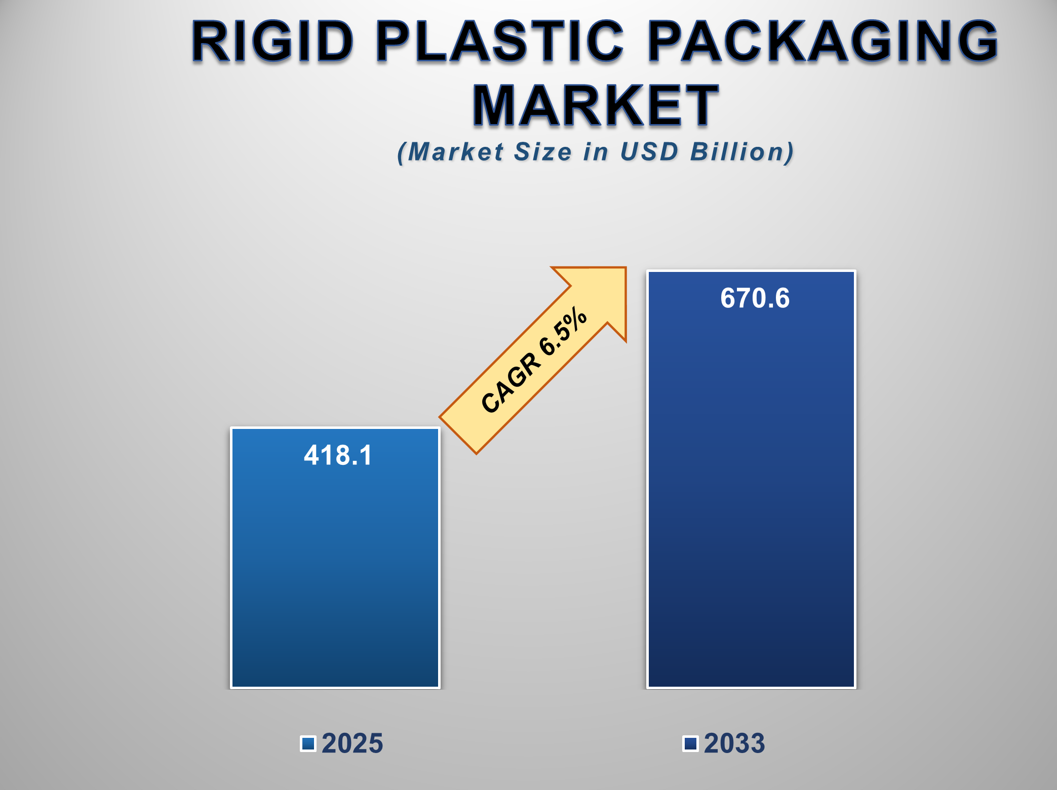 The global Rigid Plastic Packaging Market is projected to grow from USD 418.1 billion in 2025 to USD 670.6 billion by 2033, expanding at a CAGR of 6.5% during the forecast period. Rigid plastic packaging refers to non-flexible plastic formats such as bottles, containers, trays, jars, and closures, typically made from polyethylene (PE), polyethylene terephthalate (PET), polypropylene (PP), and polystyrene (PS). Its widespread application across industries stems from its durability, product protection, and ability to preserve freshness.