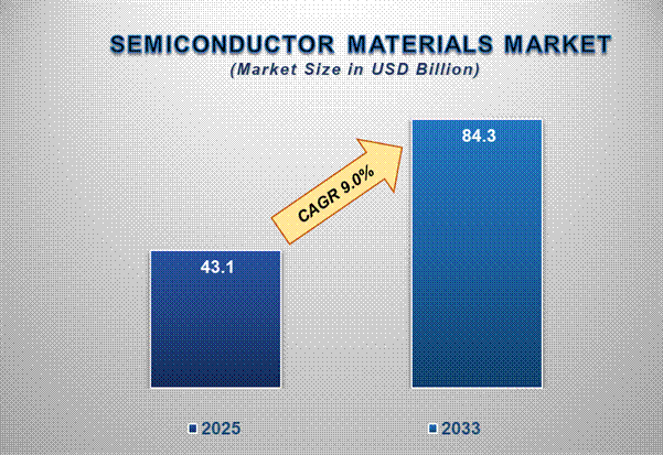 The global Semiconductor Materials Market is witnessing significant growth, fuelled by the Increasing Use of Consumer Electronics Such as smartphones, Tablets, and Wearables drives the Market Growth. Valued at USD 43.1 billion in 2025, the market is projected to reach USD 84.3 billion by 2033, growing at a CAGR of 9.0% during the forecast period.