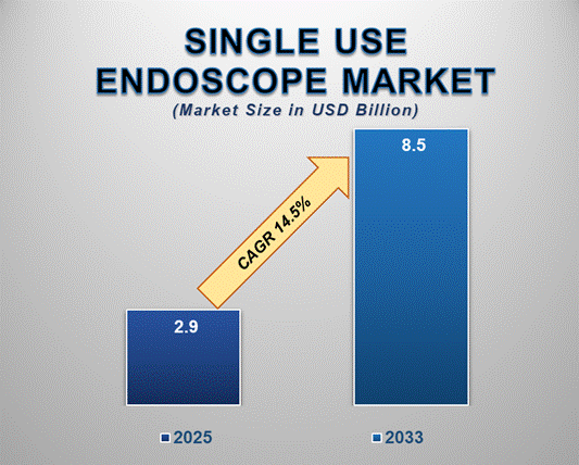 The Single Use Endoscope Market is anticipated to experience substantial growth from 2025 to 2033, fueled by a rise in preference for minimally invasive surgeries, driving the single-use endoscope market size. With an estimated valuation of approximately USD 2.9 billion in 2025, the market is expected to reach USD 8.5 billion by 2033, registering a robust compound annual growth rate (CAGR) of 14.5% over the decade.