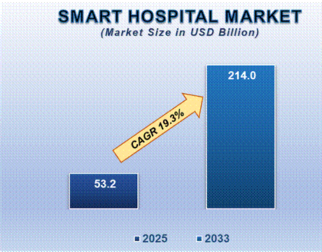 The global smart hospital market is anticipated to experience substantial growth from 2025 to 2033, increasing adoption of EHR and telehealth, the growing need for improved patient care and operational efficiency, and rising healthcare expenditure. With an estimated valuation of approximately USD 53.2 billion in 2025, the market is expected to reach USD 214.0 billion by 2033, registering a robust compound annual growth rate (CAGR) of 19.3% over the decade.