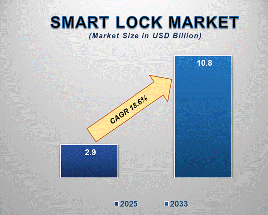 The smart lock market is anticipated to experience substantial growth from 2025 to 2033, fuelled by the increasing integration of emerging technologies with door locks to fuel market growth. With an estimated valuation of approximately USD 2.9 billion in 2025, the market is expected to reach USD 10.8 billion by 2033, registering a robust compound annual growth rate (CAGR) of 18.6% over the decade.