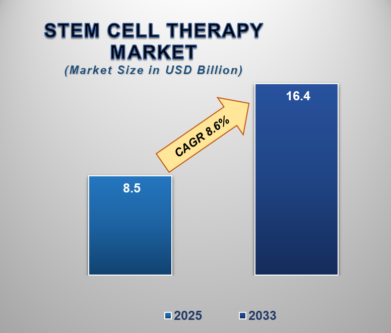 The stem cell therapy market is expected to witness significant expansion from 2025 to 2033, driven by advancements in regenerative medicine and increased investment in R&D. With an estimated value of around USD 8.5 billion in 2025, the market is forecast to grow to approximately USD 16.4 billion by 2033, registering a compound annual growth rate (CAGR) of 8.6% during the forecast period.