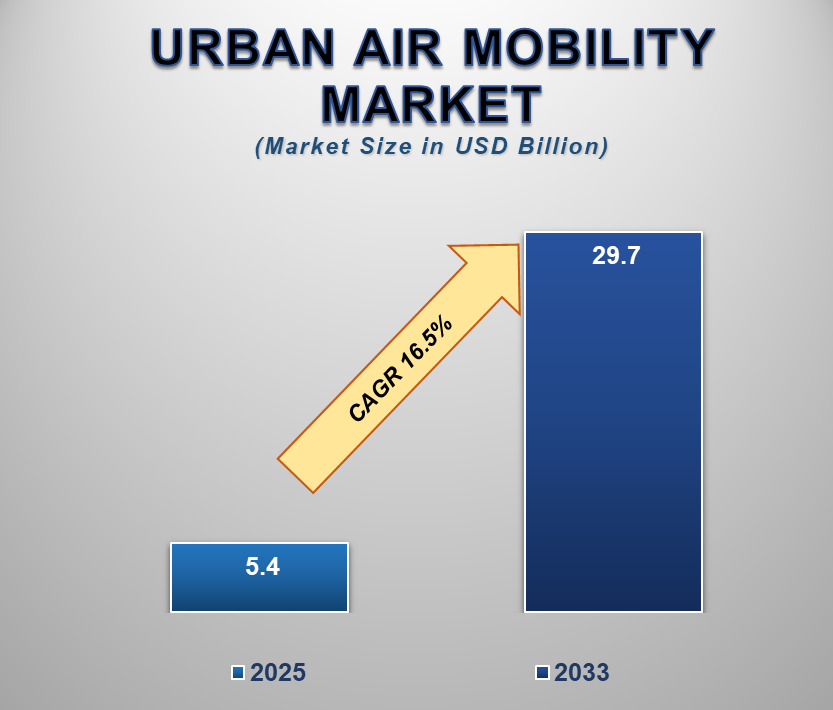 The global urban air mobility (UAM) market was valued at USD 5.4 billion in 2025 and is projected to reach approximately USD 29.7 billion by 2033, expanding at a compound annual growth rate (CAGR) of 16.5% during the forecast period. This significant growth reflects the increasing interest in innovative transportation technologies that address the challenges of urban congestion, environmental sustainability, and rapid on-demand mobility.