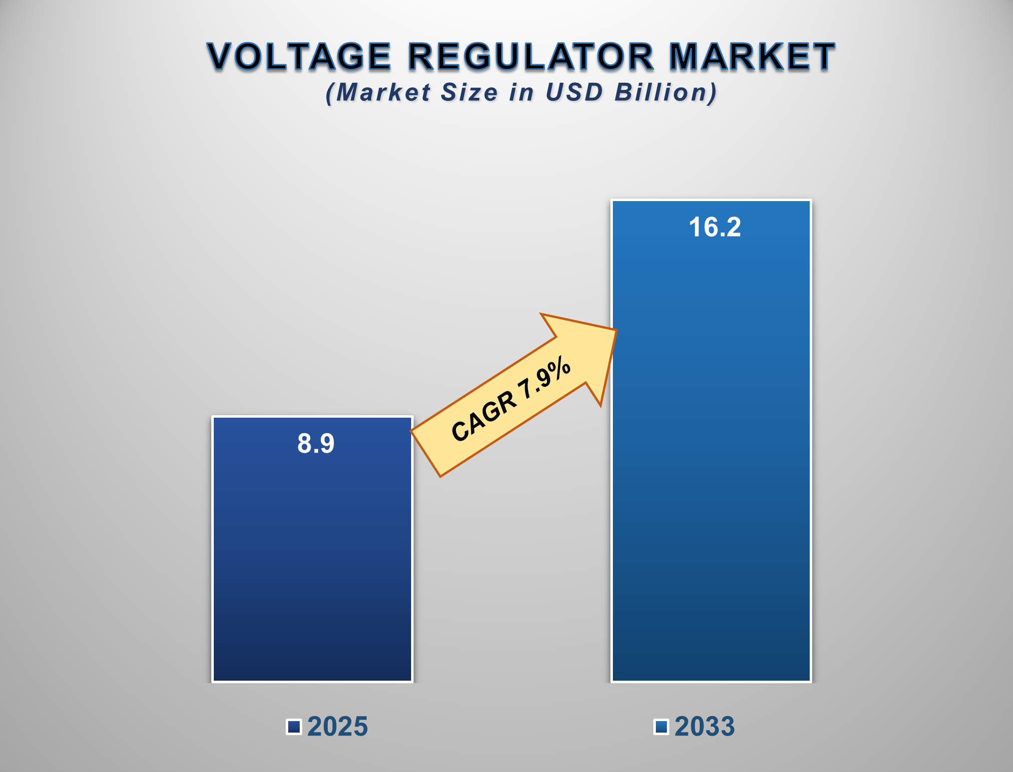 The global Voltage Regulator Market is expected to experience steady and sustained growth from 2025 to 2033, driven by the rapid expansion of consumer electronics, increasing electrification of vehicles, rising demand for stable power supply in industrial equipment, and growing deployment of advanced electronic systems across telecommunications and data centers. The market was valued at USD 8.9 billion in 2024 and is projected to reach USD 16.2 billion by 2033, growing at a CAGR of 7.9% during the forecast period.